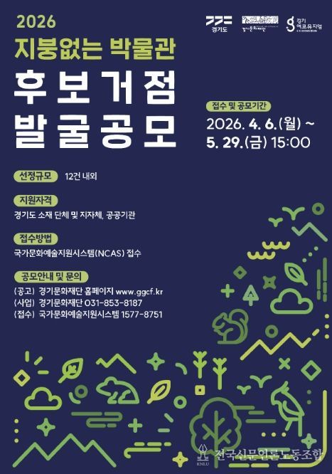 전국신문언론노동조합 김성길 기자 | 경기도와 경기문화재단은 대표적인 경기도 지역문화 브랜드인 ‘지붕없는 박물관’ 사업의 지속 가능한 운영 기반을 마련하고, 지역의 잠재적 문화 자산의 발굴과 활용을 위해 ‘2026년 지붕없는 박물관 후보거점 발굴 공모’를 추진한다.