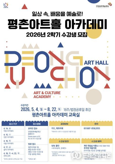 프레스유니온 김성길 기자 | 안양문화예술재단은 시민 누구나 문화예술을 자유롭게 접하고 즐겁게 배울 수 있도록 오는 4월 14일부터 23일까지 ‘2026년 평촌아트홀 아카데미’ 2학기 수강생을 모집한다.