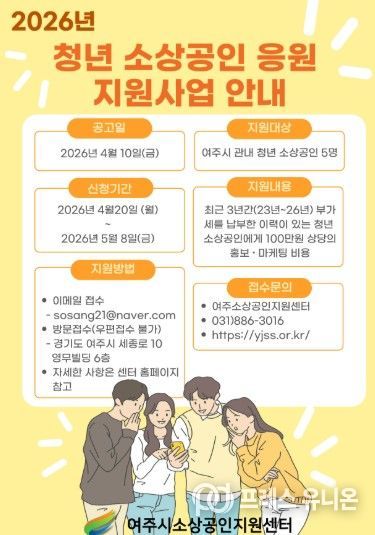 프레스유니온 강찬희 기자 | 여주시소상공인지원센터는 여주 관내 청년 소상공인의 경영 안정과 자립 기반 강화를 위해 ‘2026년 청년 소상공인 응원 지원사업’을 추진한다고 밝혔다.