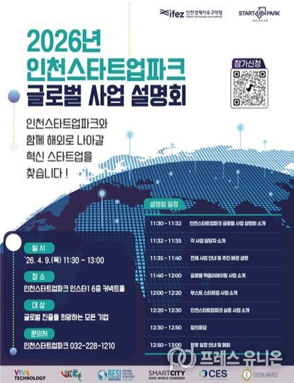 프레스유니온 강찬희 기자 | 인천경제자유구역청(IFEZ)과 인천테크노파크(ITP)는 4월 9일 인천스타트업파크에서 ‘2026 인천스타트업파크 글로벌 사업 설명회’를 성황리 개최했다고 밝혔다.
