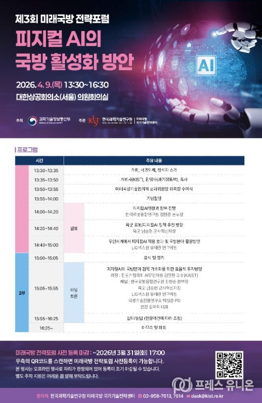 프레스유니온 강찬희 기자 | 과학기술정보통신부는 한국과학기술연구원(원장 오상록)과 함께 4월 9일 대한상공회의소에서 제3회 미래 국방 전략 토론회(전략 포럼)(‘물리적 인공지능'피지컬AI'의 국방 활성화 방안’)을 개최했다고 밝혔다.