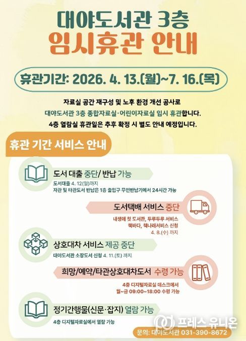 프레스유니온 김성길 기자 | 군포시 대야도서관은 노후된 자료실 환경을 개선하고 이용자 중심의 효율적인 공간 재구성을 위해 오는 4월 13일부터 7월 16일까지 리모델링 공사를 실시하고, 해당 기간동안 3층 자료실을 임시휴관한다고 밝혔다.