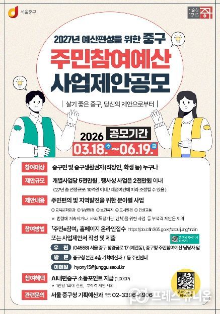 프레스유니온 강찬희 기자 | 서울 중구가 2027년 주민참여예산 사업 제안을 오는 6월 19일까지 접수한다. 주민참여예산에 대한 이해도를 높이기 위한 예산학교는 올해 기초 및 심화 과정으로 확대해 운영한다.