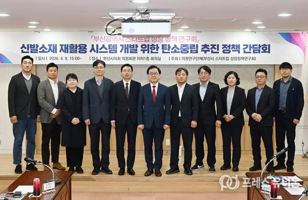 프레스유니온 강찬희 기자 | 부산광역시의회 의원연구단체인 '부산광역시 스타트업 성장 정책 연구회'는 4월 9일 오후 3시, 부산시의회 의원회관 회의실에서 ‘신발소재 재활용 시스템 개발을 통한 탄소중립 추진 정책 간담회’를 개최했다.