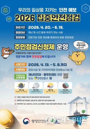 프레스유니온 강찬희 기자 | 속초시는 2026년 집중안전점검 기간을 맞아 4월 13일부터 5월 8일까지 주민점검 신청제를 운영하며 신청을 받는다.