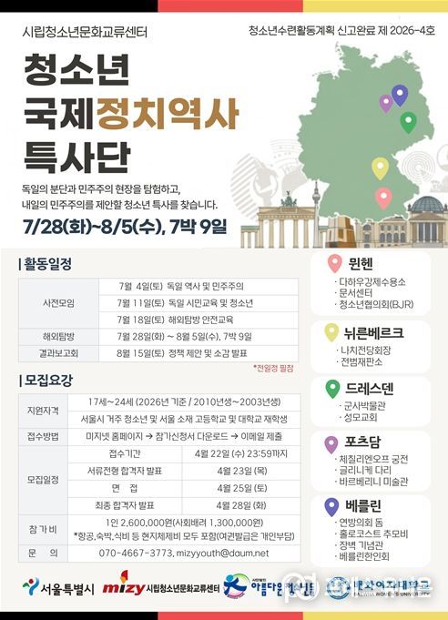 프레스유니온 강찬희 기자 | 서울시 청소년 12명이 올여름 독일로 떠난다. 서울시는 청소년이 직접 정책을 제안하고 예산 편성에도 참여하는'청소년자율예산제'의 첫 번째 사업인'청소년 국제정치역사특사단'참가자를 4월 13일부터 22일까지 모집한다.