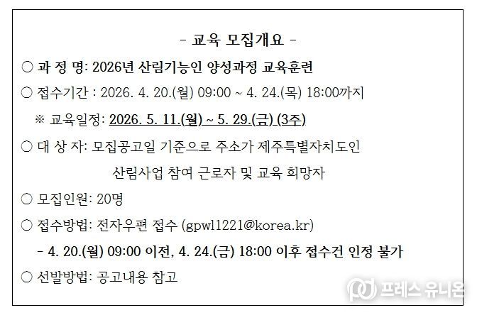이번 교육은 5월 11일부터 29일까지 3주간 산림조합중앙회 제주지역본부에서 진행되며, 공고일 기준 제주도에 주소지를 둔 도민이면 누구나 신청할 수 있다.