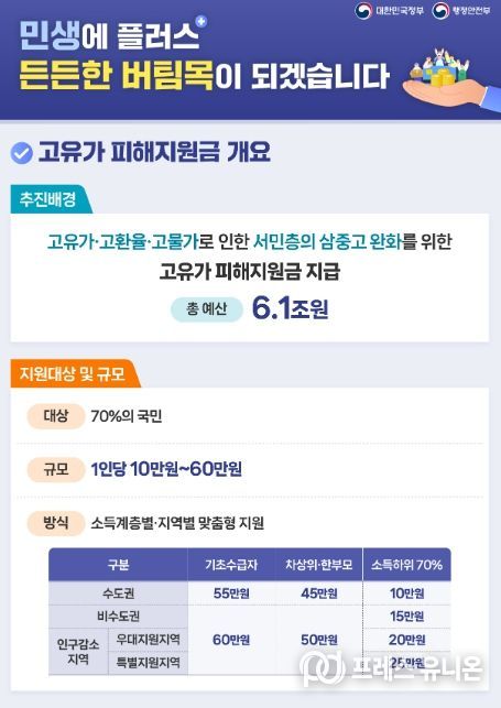 프레스유니온 강찬희 기자 | 정부는 4월 11일 정부서울청사에서 관계부처 합동 브리핑을 개최하고, 고유가 피해지원금의 신청기간 · 지원규모 등 지급 방안을 담은 「고유가 피해지원금 지급계획」을 발표했다.