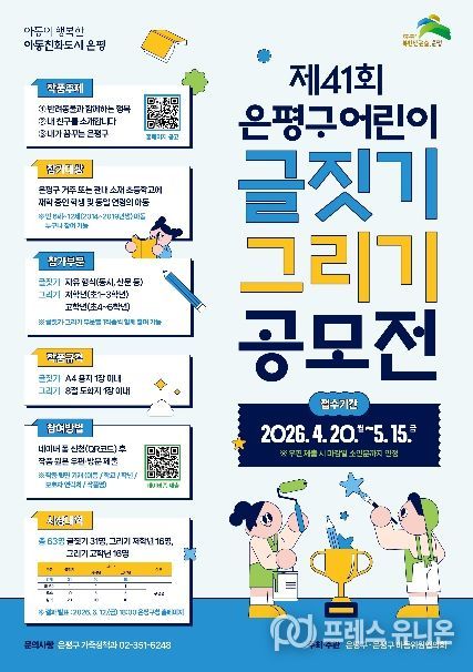 프레스유니온 강찬희 기자 | 서울 은평구는 어린이주간이 포함된 5월을 맞아, 은평구 거주 아동을 대상으로 ‘제41회 은평구 어린이 글짓기·그리기 공모전’을 개최한다고 밝혔다.