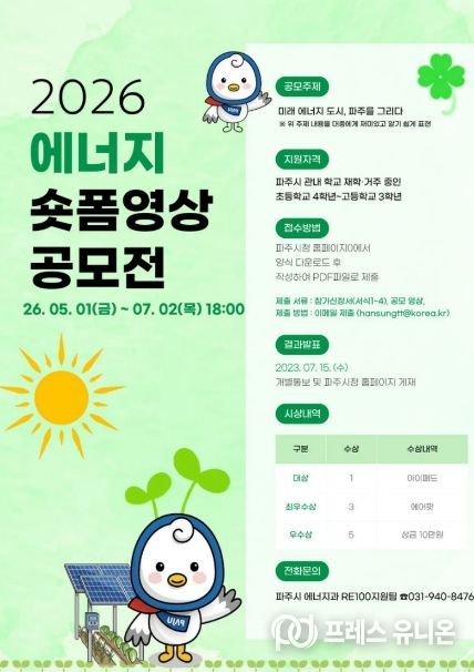 프레스유니온 김성길 기자 | 파주시는 청소년들의 에너지 인식을 제고하고 디지털 미디어 활용 역량을 강화하기 위해 녪년 파주시 청소년 에너지 숏폼 영상 공모전’을 개최한다.