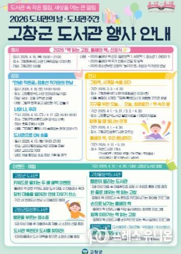 프레스유니온 강찬희 기자 | 고창군도서관이 ‘제62회 도서관주간(12~30일)’을 맞아 ‘2026 책 읽는 고창, 올해의 책 선포식’을 중심으로 군민과 함께 독서문화 확산에 나선다.