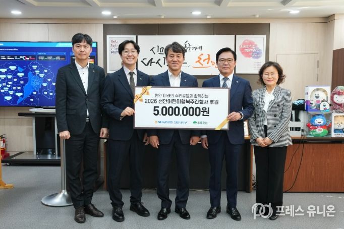 프레스유니온 강찬희 기자 | 천안시는 13일 농협중앙회 천안시지부가 제104회 어린이날 기념 ‘2026 천안어린이행복주간’의 성공적인 운영을 위해 후원금 500만 원을 기탁했다고 밝혔다.