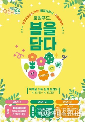 프레스유니온 강찬희 기자 | 양양군이 오는 4월 17일부터 19일까지 3일간 양양 웰컴센터 2층 ‘매일아홉시’ 로컬푸드마켓에서 봄맞이 판매행사 '로컬푸드, 봄을 담다 - 매일아홉시 구매혜택전'을 개최한다.