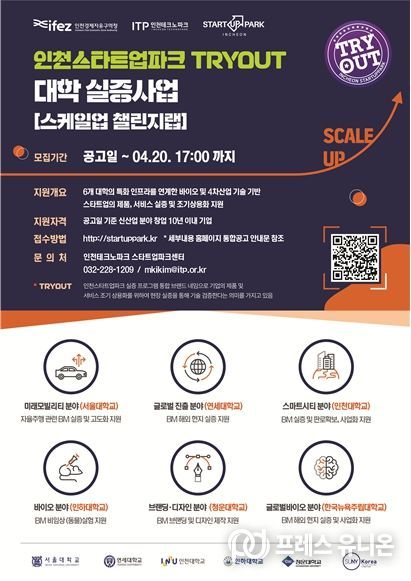 프레스유니온 강찬희 기자 | 인천경제자유구역청은 ‘2026 인천스타트업파크 TRYOUT 대학 실증사업(스케일업 챌린지랩)’의 통합공고를 시행하고 참여 기업을 모집한다고 밝혔다.