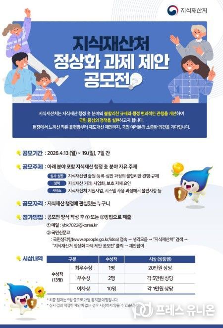 프레스유니온 강찬희 기자 | 지식재산처는 지식재산 행정 전반에 남아있는 비정상적인 관행과 불합리한 제도를 발굴하고 이를 개선하기 위해 전 국민을 대상으로 '지식재산처 정상화 과제 제안 공모전'을 실시한다고 밝혔다.