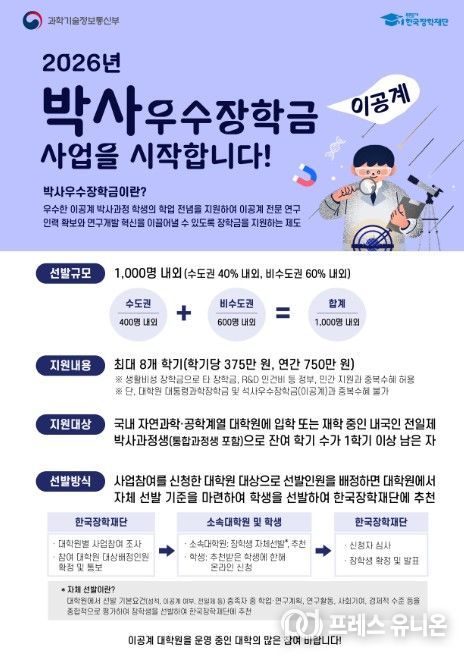 프레스유니온 강찬희 기자 | 과학기술정보통신부와 한국장학재단은 2026년도 이공계 박사 우수장학금 사업을 올해 처음으로 시행한다고 밝혔다. 이공계 박사 우수장학금은 사업 참여를 신청한 대학원의 소속 학생 중 장학생을 선발하며, 대학원의 사업 참여 신청 기간은 4월 14일부터 4월 20일까지이다.