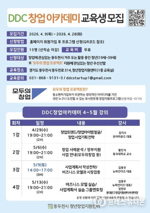 모집 대상은 동두천시에 거주하거나 활동 중인 19세부터 39세까지의 청년으로, 창업에 관심 있는 누구나 신청할 수 있다. 모집 인원은 15명 내외이며, 참가비는 무료다.