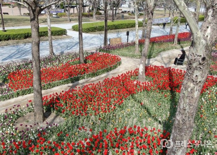 지난해 가을에 식재한 9만본의 튤립, 수선화를 포함해 총 13만6,000본의 형형색색 봄꽃이 만개했다.