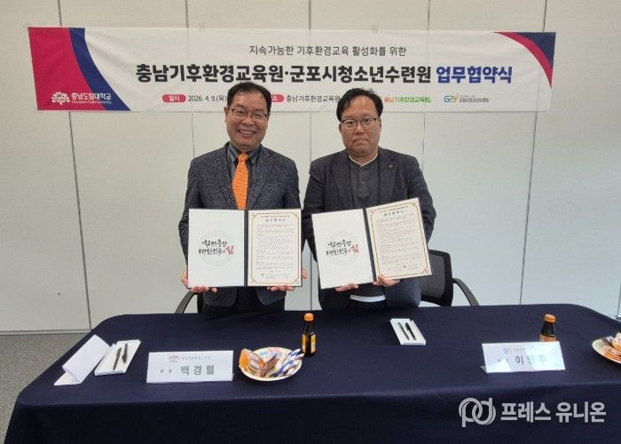 프레스유니온 김성길 기자 | (재)군포시청소년재단이 운영하는 군포시청소년수련원(충남 청양)과 충남기후환경교육원(충남 청양)은 4월 9일, 미래세대의 지속가능 기후환경교육 활성화를 위한 업무협약을 체결했다고 전했다.
