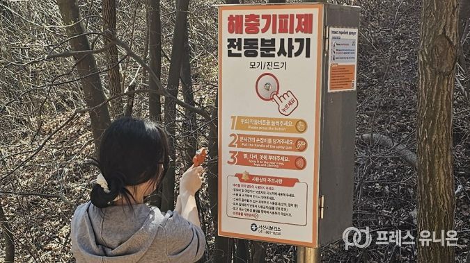 해충기피제 자동분사기는 등산로 입구, 저수지, 산책로 등 유동 인구가 많고 진드기가 많은 구역에 설치됐다.