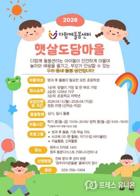 이용 신청은 원주시 아동돌봄 온라인 플랫폼 ‘원주아이온돌봄’ 홈페이지 또는 방문을 통해 가능하다. 자세한 사항은 전화로 문의하면 된다.