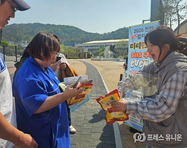 시는 야구장을 찾은 1만 7,000여 명의 관람객을 대상으로 ‘2026 천안 K-컬처 박람회’와 ‘빵의 도시 천안’ 브랜드를 알리기 위해 독립된 홍보 부스를 마련하고 시기별 주요 축제 일정 홍보에 주력했다.
