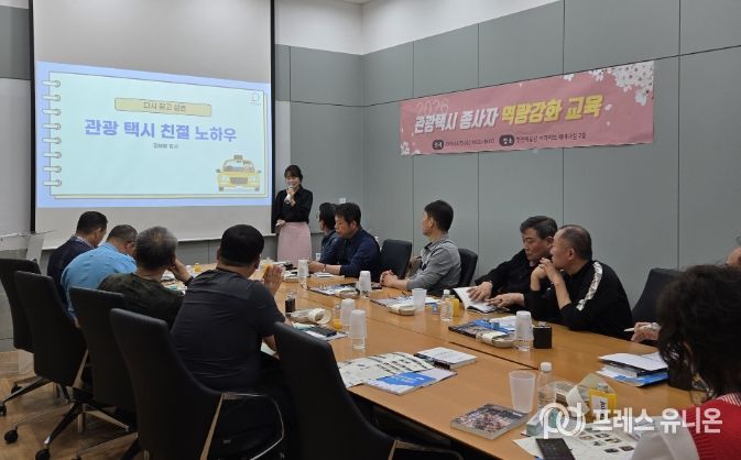 프레스유니온 강찬희 기자 | 천안시가 오는 6월 관광택시 시범운영을 앞두고 15일 천안박물관에서 참여 운행기사 12명을 대상으로 2차 실무 교육을 실시했다.