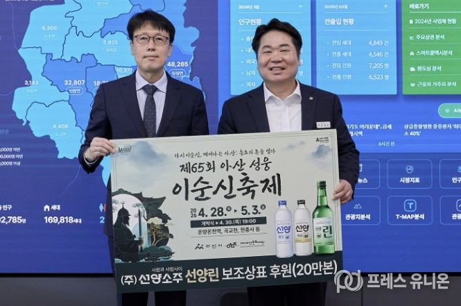 프레스유니온 강찬희 기자 | 아산시가 충청권 대표 주류 기업인 ㈜선양소주와 함께 ‘제65회 아산 성웅 이순신축제’의 성공적인 개최를 위해 다시 한번 협력에 나선다.
