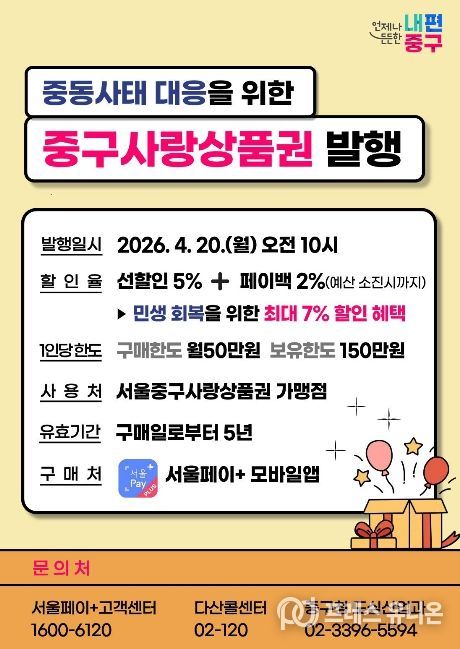 프레스유니온 강찬희 기자 | 서울 중구가 중동전쟁으로 인한 경기 불안과 소비 위축에 대응하기 위해 20억 원 규모의 '서울중구사랑상품권'을 오는 20일 발행한다.