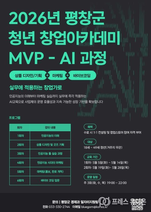 프레스유니온 강찬희 기자 | 평창군은 강원특별자치도 공모사업인 '2026년 지역산업 맞춤형 일자리 창출 지원사업'으로 ‘청년 창업아카데미(MVP)-AI 과정’을 본격적으로 운영한다.