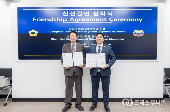 프레스유니온 강찬희 기자 | 강남구의회는 16일 오전 강남구의회를 내방한 몽골 항올구시민대표회의(의장 바트-오르길) 대표단을 접견하고 협약을 체결했다.