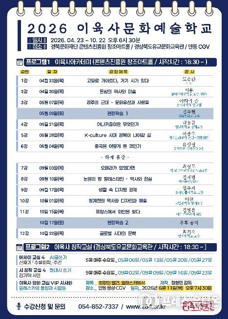 프레스유니온 강찬희 기자 | 안동시 이육사문학관은 4월 23일부터 '2026 이육사문화예술학교'를 개강한다. '2026 이육사문화예술학교'는 국내외 저명 강사들이 참여해 인문․예술 전반의 다양한 주제를 다루며, 시민이 일상에서 인문학의 깊이를 체감할 수 있도록 풍성하고 내실 있는 강연으로 운영된다.