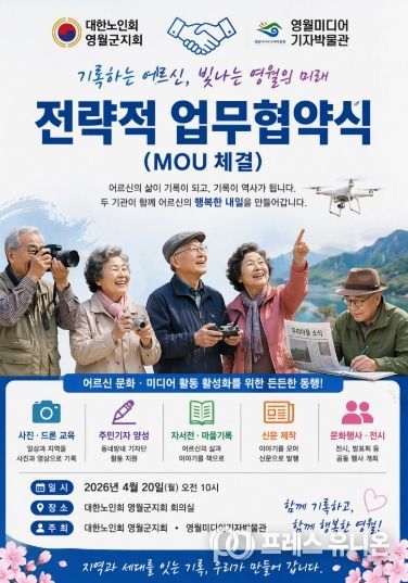 프레스유니온 강찬희 기자 | 대한노인회 영월군지회(지회장 엄기원)와 영월미디어기자박물관은 어르신 문화활동과 기록문화 확산을 위한 전략적 업무협약(MOU)을 체결한다.