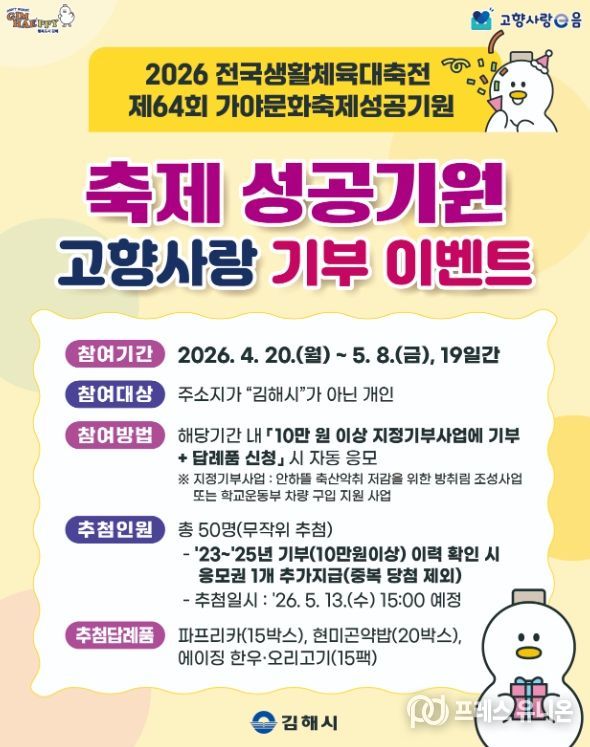 프레스유니온 강찬희 기자 | 김해시는 대규모 체육·문화 행사의 성공적 개최를 기원하고 지역의 시급한 현안을 해결하는 지정기부 사업을 널리 알리기 위해 20일부터 5월 8일까지 19일간 ‘고향사랑 기부 혜택 플러스’ 이벤트를 실시한다.