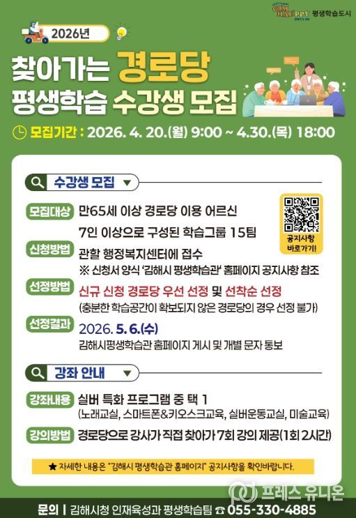 프레스유니온 강찬희 기자 | 김해시는 평생학습 사각지대 해소와 어르신의 활기찬 노후 지원을 위해 오는 5월부터 ‘2026년 찾아가는 경로당 평생학습 프로그램’을 운영한다고 17일 밝혔다.