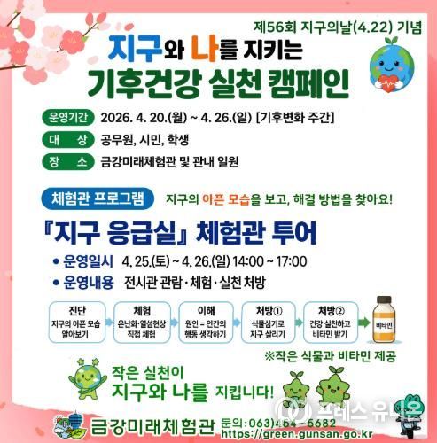 프레스유니온 강찬희 기자 | 군산시는 제56회 지구의 날(4월 22일)과 기후변화주간을 맞아 시민들의 기후위기 대응 참여를 유도하기 위해 4월 20일부터 26일까지 ‘지구와 나를 지키는 기후건강 실천 캠페인’을 운영한다고 밝혔다.