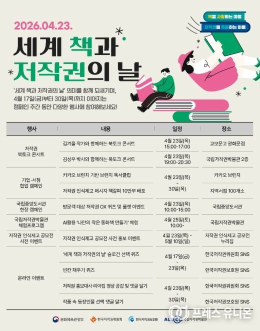 프레스유니온 강찬희 기자 | 문화체육관광부는 한국저작권위원회, 한국저작권보호원과 함께 ‘세계 책과 저작권의 날’을 맞이해 4월 17일부터 30일까지 ‘저작권 보호 캠페인’을 추진한다. 이를 통해 책과 저작권이 지닌 소중한 가치를 되새기고, 창작자의 권리를 존중하는 문화를 국민 일상에 확산할 계획이다.