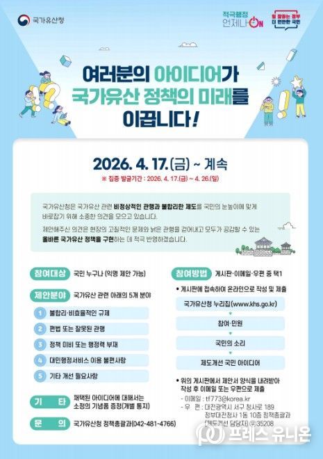 프레스유니온 강찬희 기자 | 국가유산청은 국가유산 관련 비정상적인 관행과 불합리한 제도를 바로잡기 위한 정상화 과제를 발굴하고자 17일부터 국민들의 참신한 아이디어를 받는다.