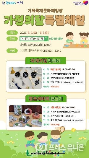 프레스유니온 강찬희 기자 | 거제시 목재문화체험장(동부면 거제중앙로 325, 거제자연휴양림 내 위치)은 가정의 달을 맞아 오는 5월 2일과 5월 3일 이틀간 『자개키링&발포세라믹 만들기 특별체험』을 운영한다고 밝혔다.