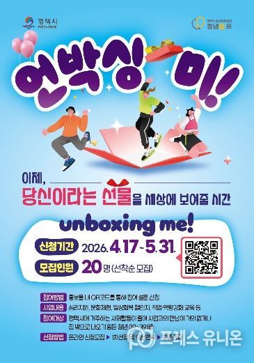 프레스유니온 김성길 기자 | 평택시 청년지원센터는 4월 17일부터 5월 31일까지 평택시에 거주하는 사회활동이 줄어 사람과의 만남이 거의 없거나 집 밖으로 나오기 힘든 청년의 일상 회복과 사회 참여 촉진을 위해 실시하는 지원사업 '언박싱 미!' 참여자를 모집한다.