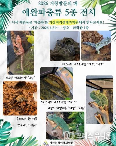 프레스유니온 강찬희 기자 | 거창군은 거창천적생태과학관에서 2026년 ‘거창방문의 해’를 맞아 오는 21일부터 어린이와 학생, 가족 관람객을 대상으로 이색 애완 파충류 전시를 개최한다고 밝혔다.
