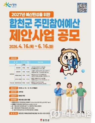 프레스유니온 강찬희 기자 | 합천군은 2027년도 예산편성을 위한 주민참여예산 제안사업 공모를 6월 16일까지 실시하며, 올해부터 공모 분야를 기존 1개 모델 3개 유형에서 3개 모델 5개 유형으로 확대 개편한다고 밝혔다.