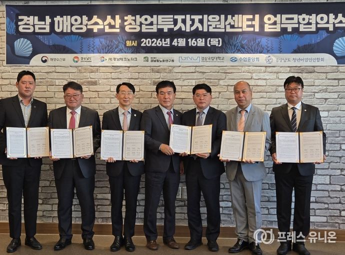 프레스유니온 강찬희 기자 | 경상국립대학교 해양과학대학은 경상남도 해양수산 창업투자 활성화를 위해 4월 16일 경남테크노파그에서 경상남도, 경남테크노파크, 경남항노화연구원, 수협중앙회 경남본부, 경상남도 청년어업인연합회 등과 업무협약(MOU)을 체결했다.