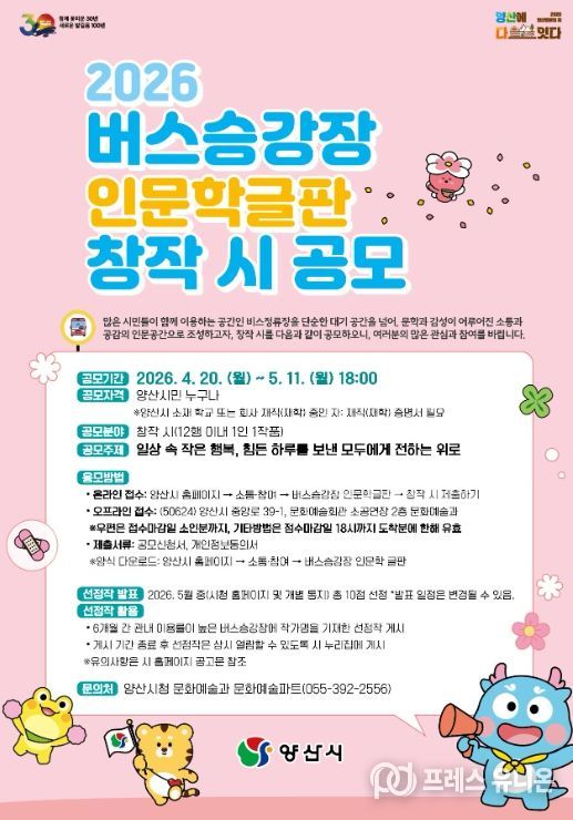 프레스유니온 강찬희 기자 | 양산시는 시민들의 일상 공간인 버스승강장을 문학적 감성이 흐르는 인문 공간으로 조성하기 위해 ‘2026 버스승강장 인문학글판 창작시 공모’를 추진한다.