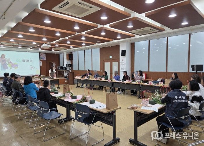 부곡동주민센터에서 열린 1회차 프로그램에서는 참여자 간 어색함을 해소하고 친밀감을 높이기 위해 자기소개 시간을 시작으로 꽃꽂이 체험이 진행됐다. 참여자들은 꽃을 만지고 작품을 완성하는 과정에서 자연스럽게 대화를 나누며 서로를 알아가는 시간을 가졌다.