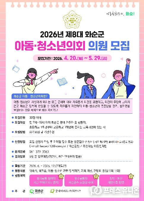 프레스유니온 강찬희 기자 | 화순군은 ‘2026년 제8대 화순군 아동·청소년의회’ 의원 30명을 오는 4월 20일부터 5월 29일까지 공개 모집한다고 밝혔다.