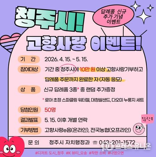 프레스유니온 김성길 기자 | 청주시는 고향사랑기부제 답례품 신규 추가를 기념해 기부 참여자를 대상으로 ‘답례품 추가 증정 이벤트’를 진행한다고 18일 밝혔다.