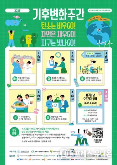 또한 ‘기후 동행 탄소중립 생활 실천 챌린지’는 20일부터 24일까지 카카오톡 채널을 이용한 온라인 실천 인증 캠페인으로 운영한다. 요일별로 다른 실천 주체를 정해 참여자들이 인증 숏을 공유하고, 추첨으로 모바일 쿠폰을 제공한다. 실천 주제는 ▲잔반 제로(Zero) ▲다회용품 사용 ▲친환경 이동 ▲소등 행사 참여 ▲채식 ▲물품 기부 등이다.