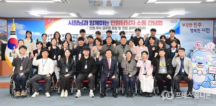 프레스유니온 강찬희 기자 | 진주시는 지난 17일 시청 3층 문화강좌실에서 1분기 민원 처리 우수공무원과 친절 공무원 40여 명을 대상으로 ‘표창 수여식 및 소통 간담회’를 가졌다.