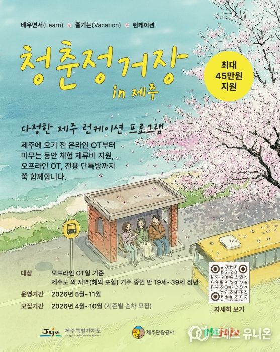 프레스유니온 강찬희 기자 | 제주특별자치도와 제주관광공사(사장 고승철)는 오는 5월 3일까지 제주인구정책 통합플랫폼을 통해 도외 거주 청년을 대상으로 제주에서 배우며 방학을 즐길 런케이션 참가자를 모집하고 있다고 17일 밝혔다.